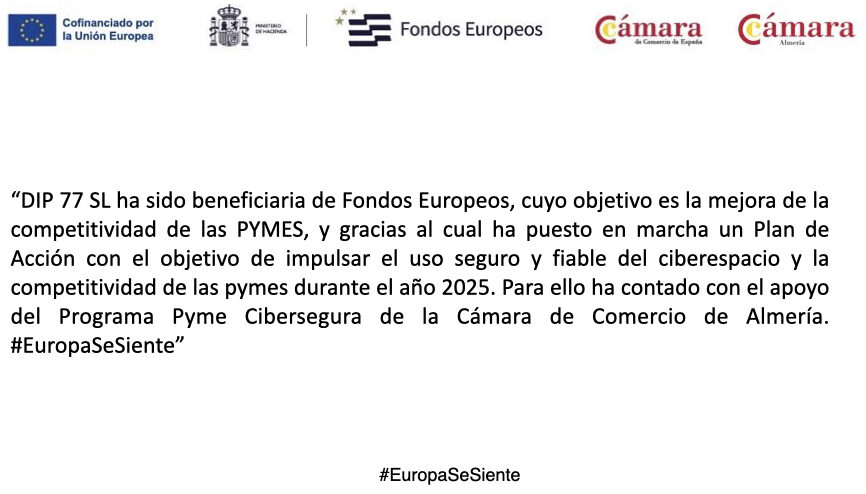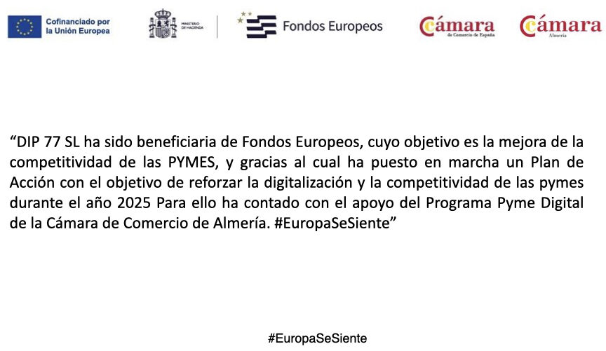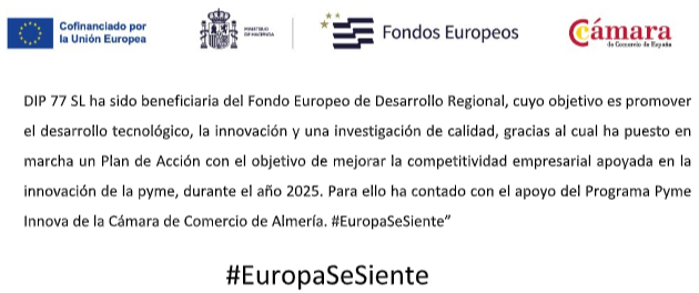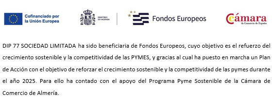 DIP 77 SL ha sido beneficiaria del Fondo Europeo de Desarrollo Regional cuyo objetivo es mejorar el uso y la calidad de las tecnologías de la información y de las comunicaciones y el acceso a las mismas y gracias al que ha implantado Incremento de la sostenibilidad ambiental Aislamiento Acústico,Equipos de mejora de eficiencia energética para climatización para la mejora de competitividad y productividad de la empresa. Esta acción ha tenido lugar durante 2022. Para ello ha contado con el apoyo del programa de COMPETITIVIDAD TURÍSTICA de la Cámara de Comercio de Almería.